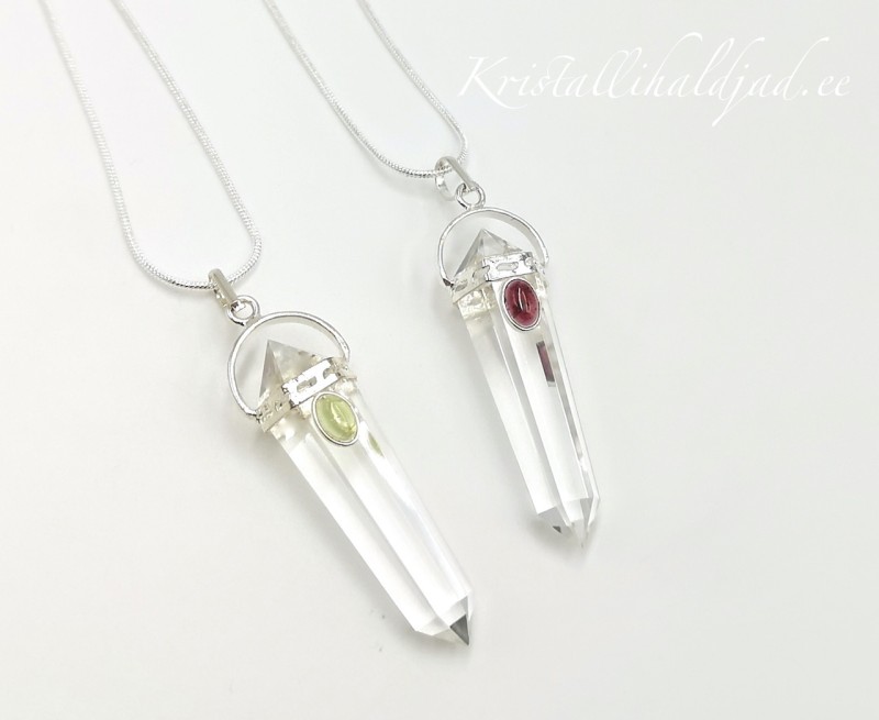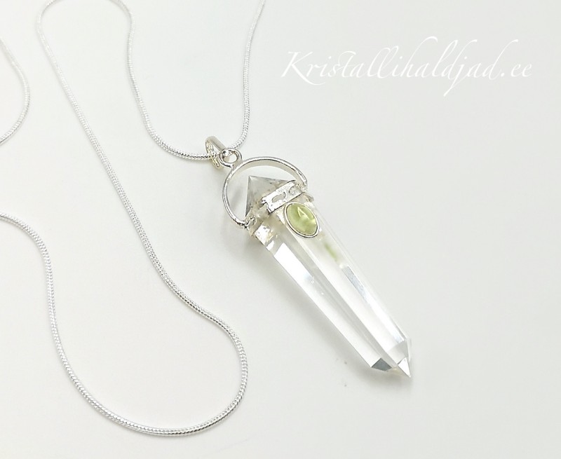 Väga ilus kirgas mäekristall ripats väikese peridootiga pikkusega 5 cm ehtemetallist kinnitusega. Tipp ripatsina on väga hea keskse energiakiirgamise kanali joondaja, hoides sinus energiad liikumas maa ja taeva vahel - ühendus ja maandus.
