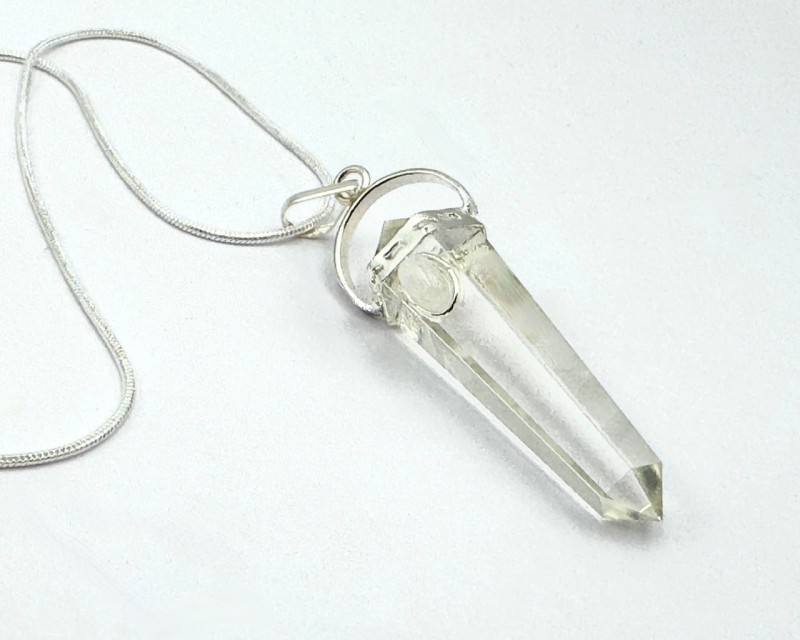 Väga ilus kirgas mäekristall ripats väikese sinise kuukiviga pikkusega 5 cm ehtemetallist kinnitusega. Tipp ripatsina on väga hea keskse energiakiirgamise kanali joondaja, hoides sinus energiad liikumas maa ja taeva vahel - ühendus ja maandus.