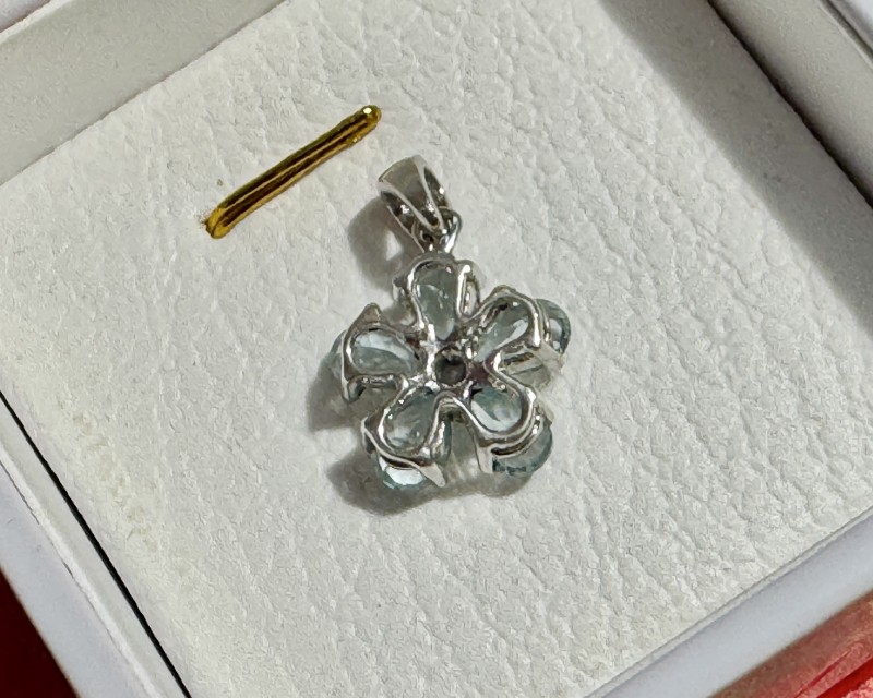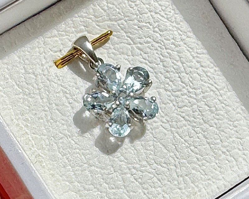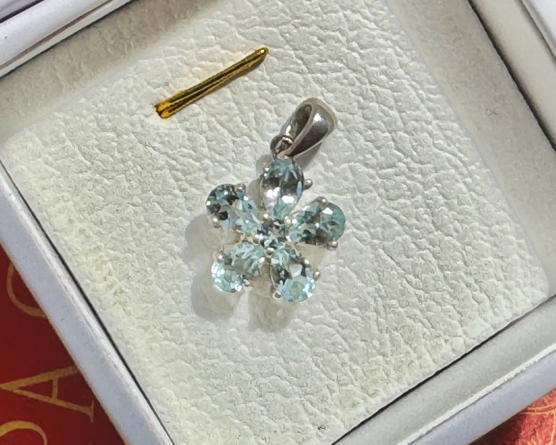 Imekaunis viie fassetitud sinise topaasiga lillekujuline hõberipats 1 cm, koos kinnitusega 1,7 cm, 925 hõbe.