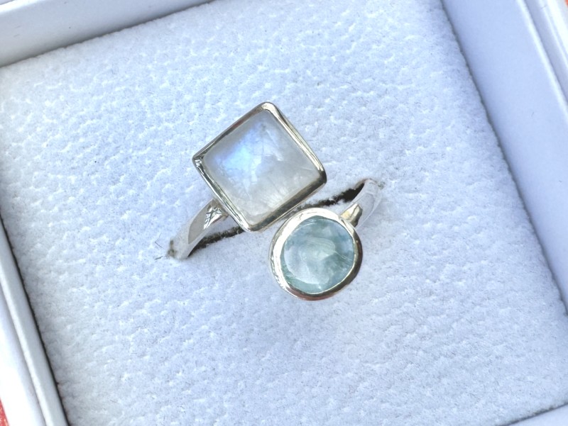 Ehte info: Kauni disainiga 925 hõbesõrmus sinise kuukivi ja sinise topaasiga. Suurus Ø 17.2 on kergelt muudetav.