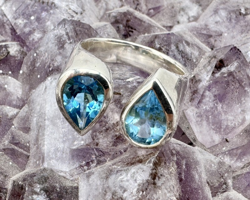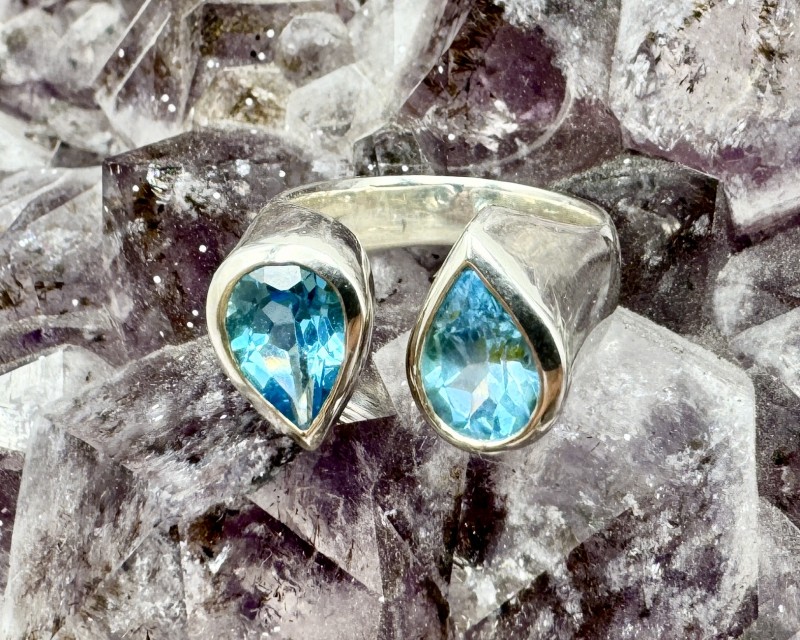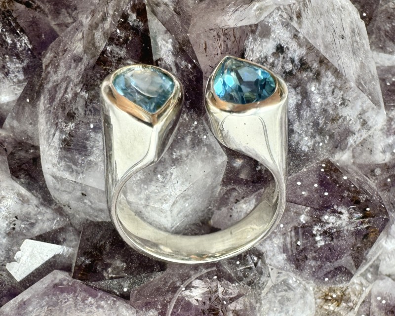 Ehte info: Särava kahe fassetitud sinise topaasiga hõbesõrmus suurusega Ø 17.7, 925 hõbe. Sõrmuse kõrgus 0.5 cm, pealmise osa laius 1.9 cm, üks topaasi tilgake on 1.2x0.9 cm.