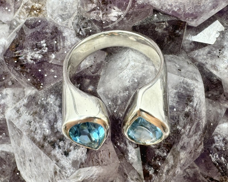Ehte info: Särava kahe fassetitud sinise topaasiga hõbesõrmus suurusega Ø 17.7, 925 hõbe. Koos nagu 2 sõpra.
