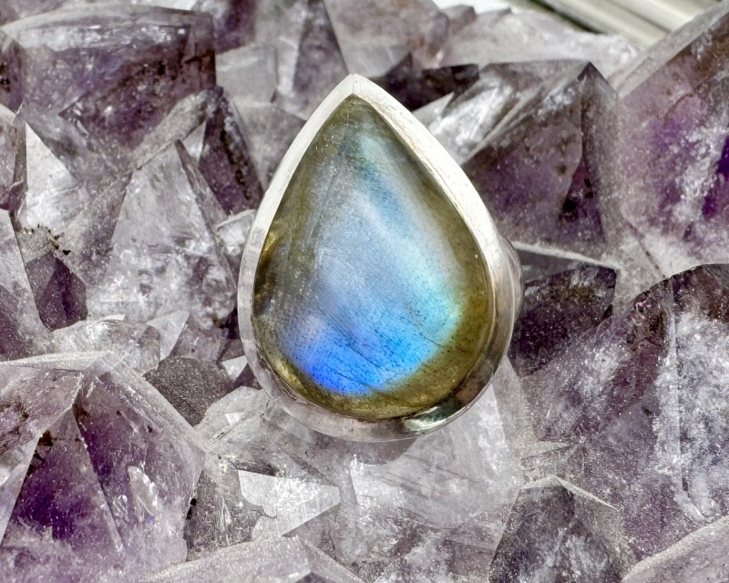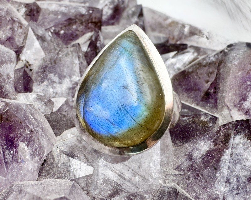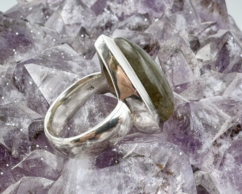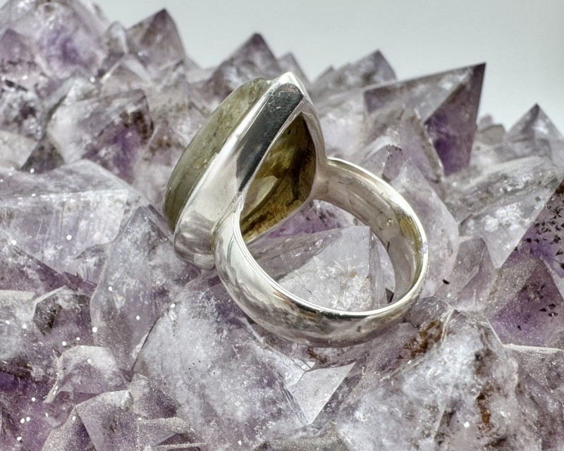 Ehte info: See erksiniselt kumava tilgakujulise labradoriidiga hõbesõrmus on suurusega Ø 16.5, 925 hõbe. Pealmise silm-hõberaami mõõt 2.5 x 1.8 cm, kõrgus 0.8 cm.