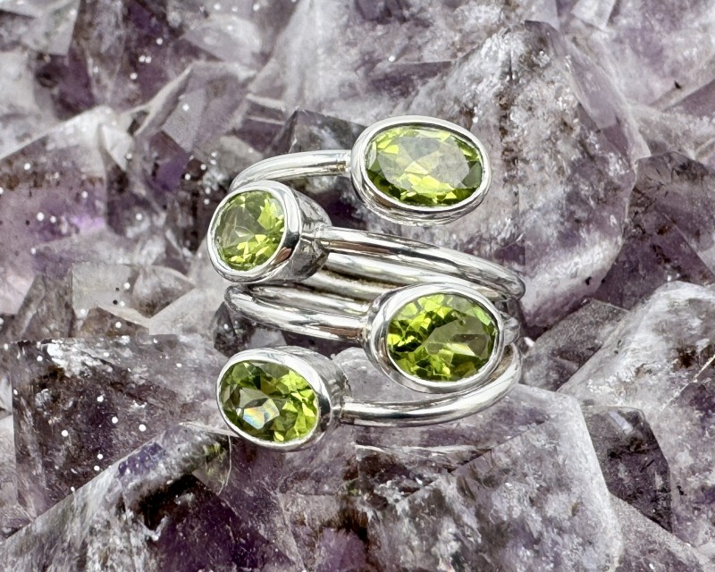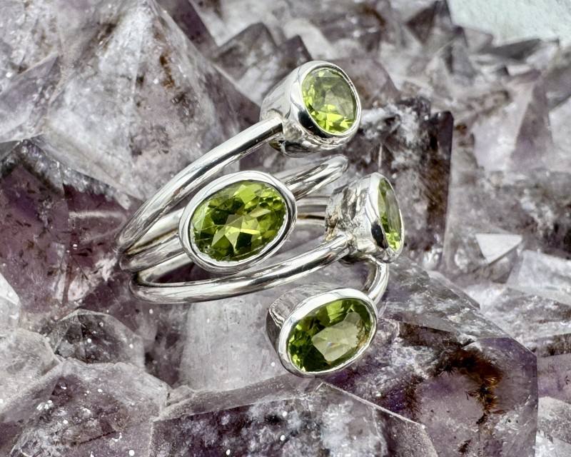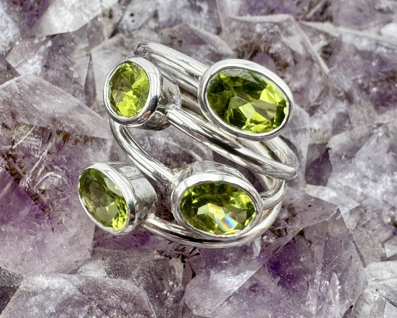 Ehe pildil: 925 hõbesõrmus 4 puhtalt läbikumava fassett-lihviga peridooti ehk oliviiniga. Suurus Ø 17.5 on kergelt muudetav.