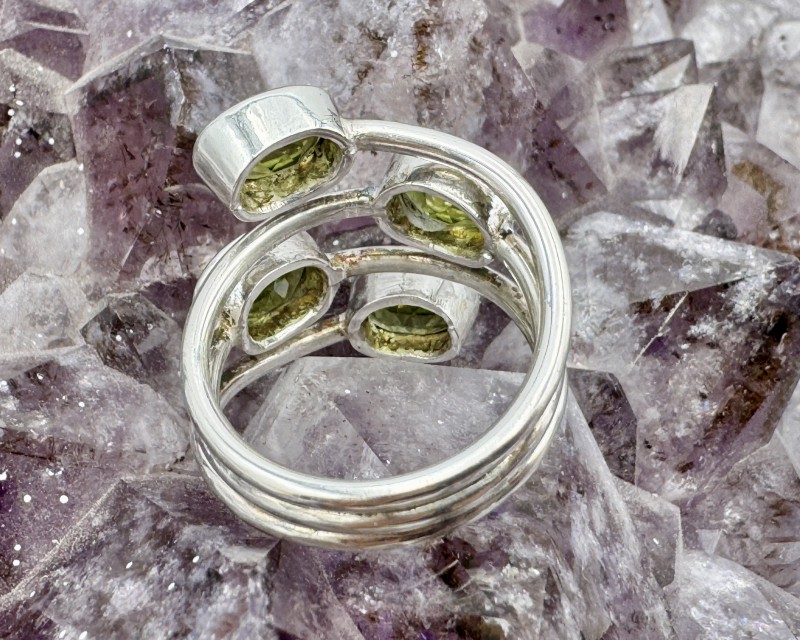 Ehe pildil: 925 hõbesõrmus 4 lihvitud puhtalt läbikumava peridooti ehk oliviininiga. Suurus Ø 17.5 on kergelt muudetav. Sõrmuse pealse laius 2.3 cm, üks peridooti kivim on 0.9 x 0.7 cm.