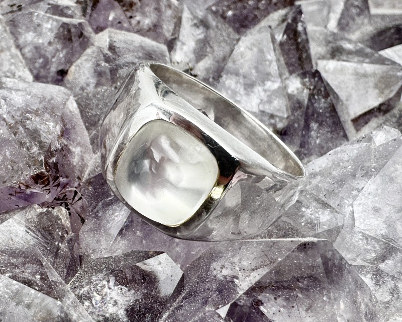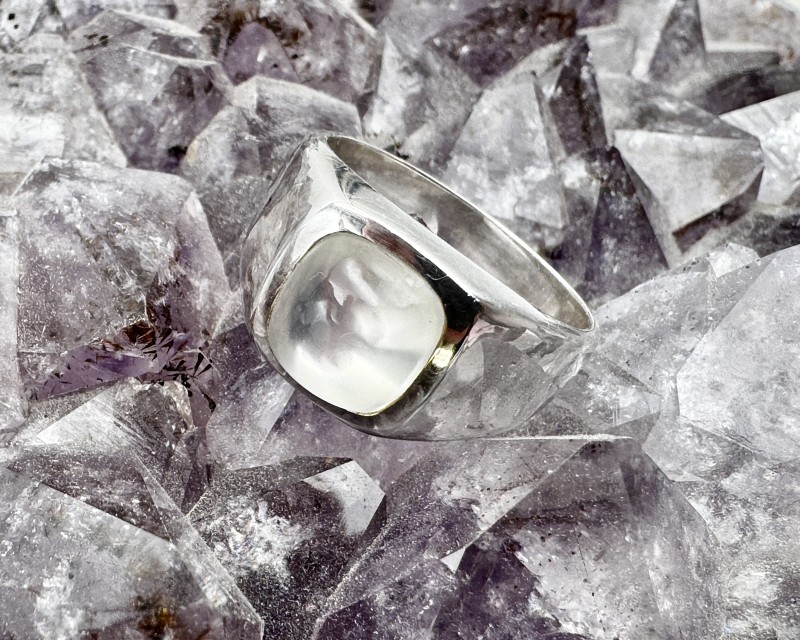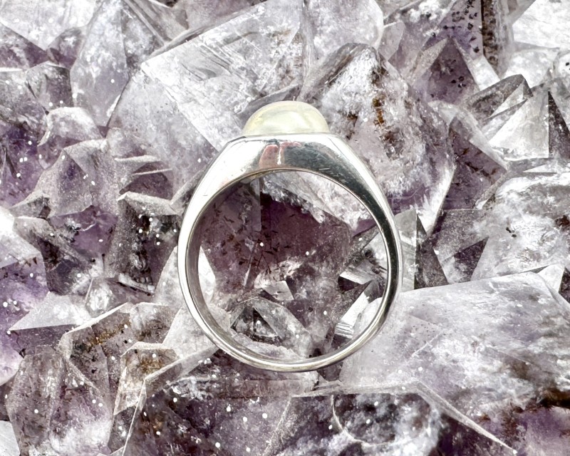 Ehe pildil: 925 hõbesõrmus erakordselt kirka pärlmutterkumaga valge kuukiviga, cabochon lihviga, suurus Ø 19.