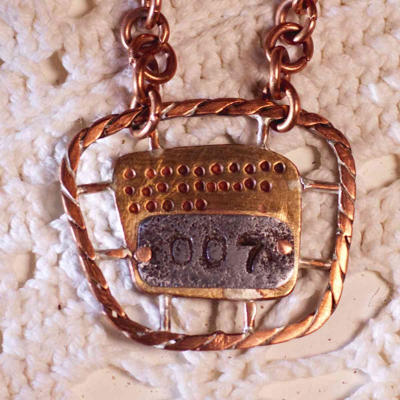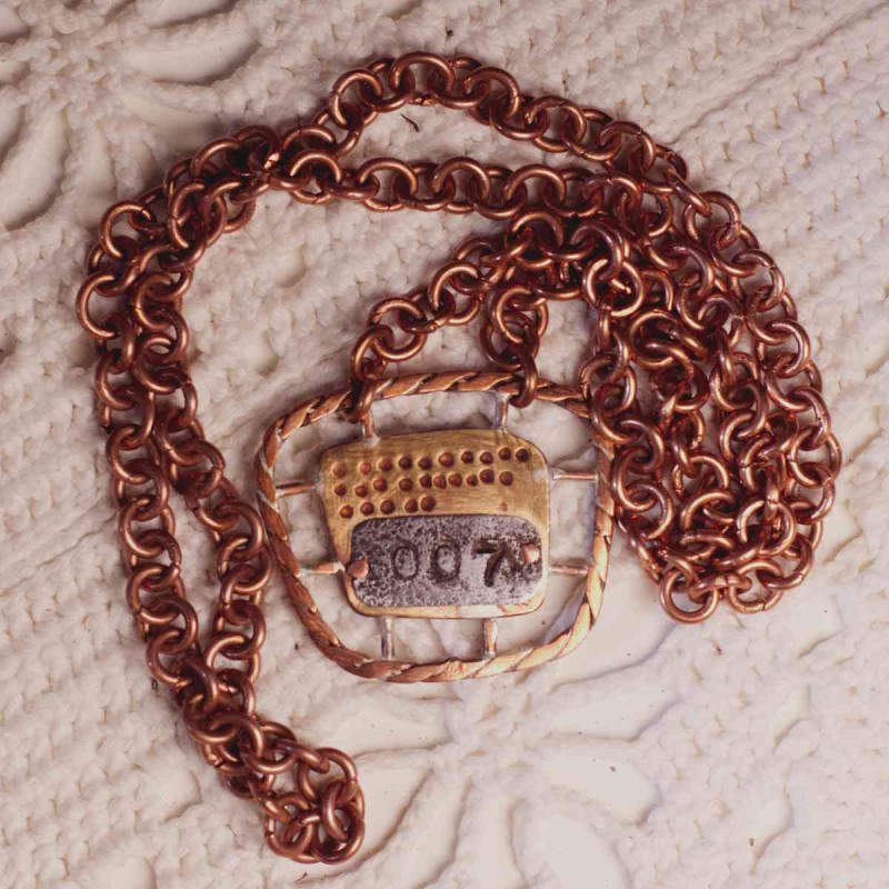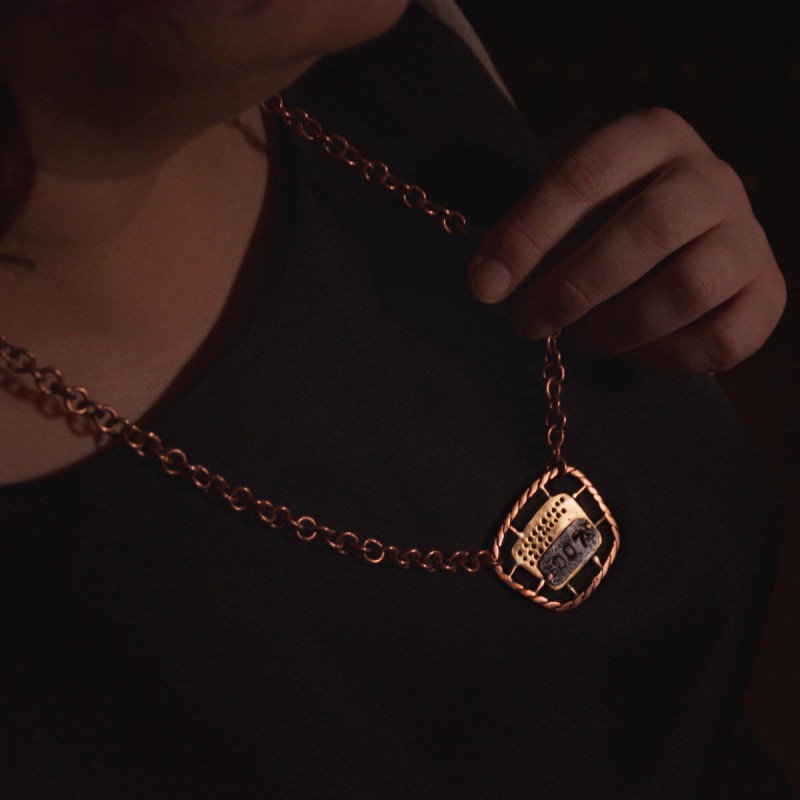 Materjal. Ripatsi keskmine osa on messingust. Sellel olev 007 märk on rauast. Kett on vasest, pikkusega 66 cm.