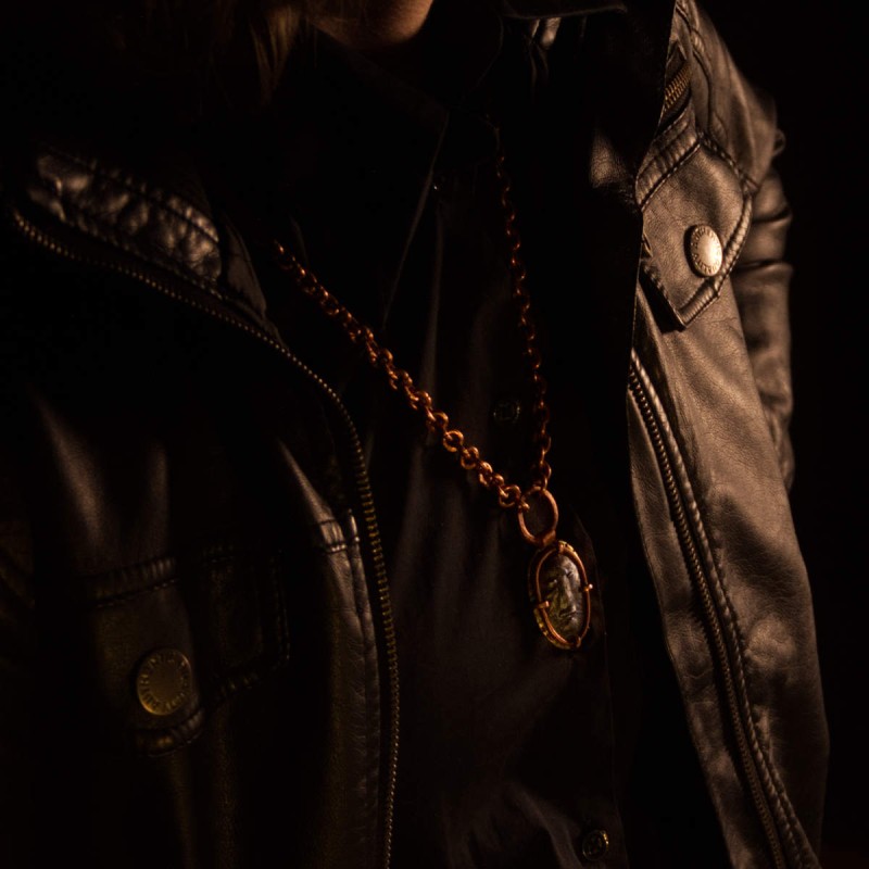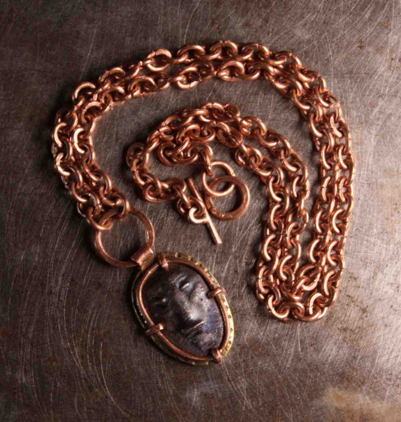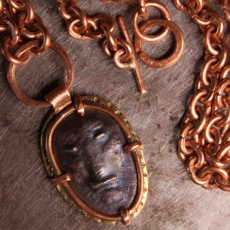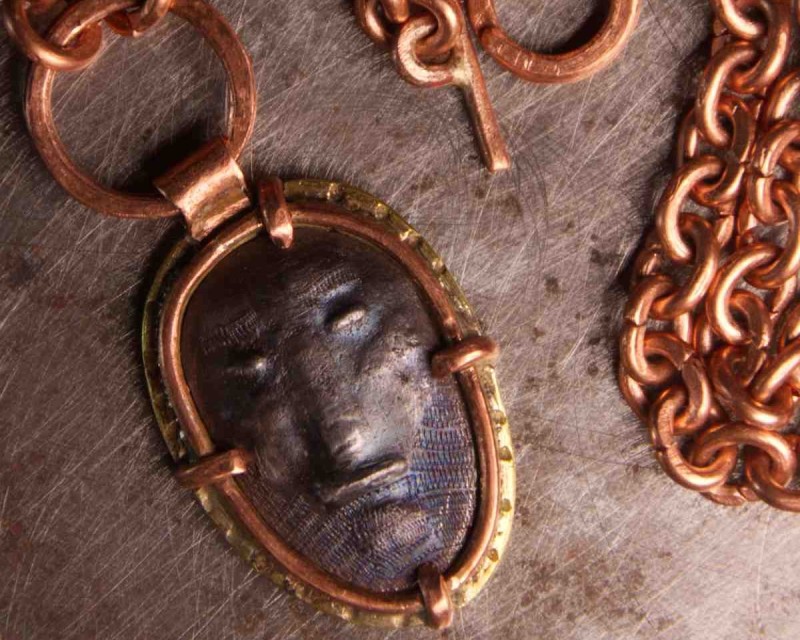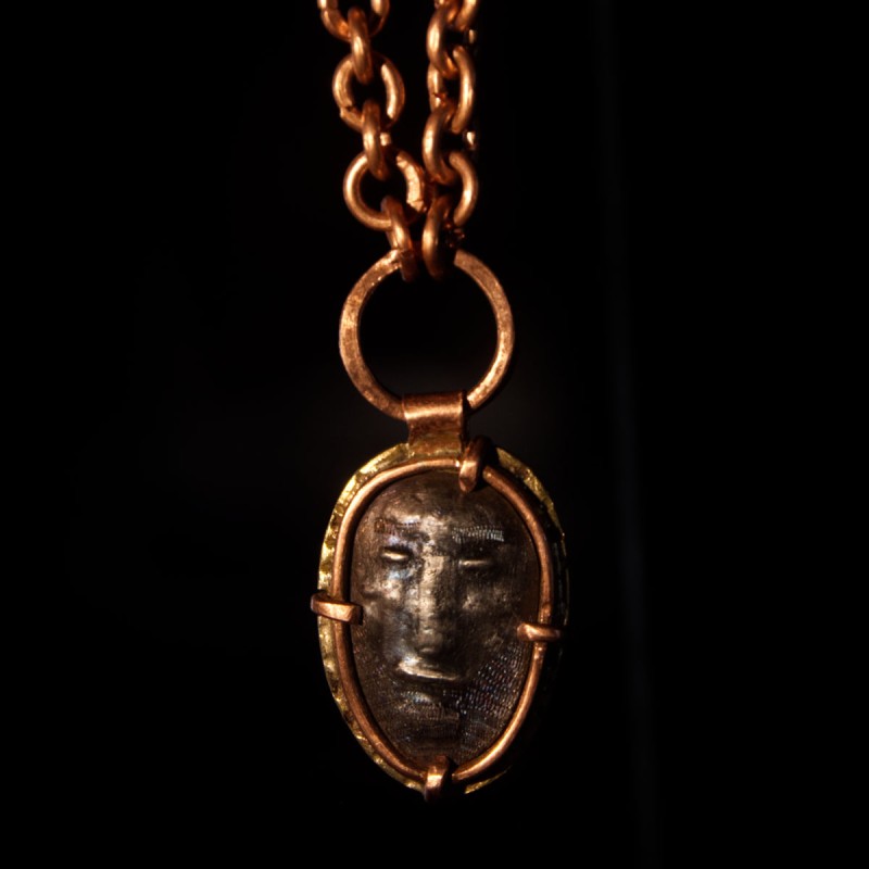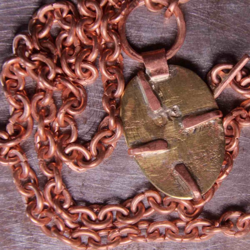 Kett on vasest, näo alus messingist ja nägu on rauast. Keti pikkus: 60 cm.