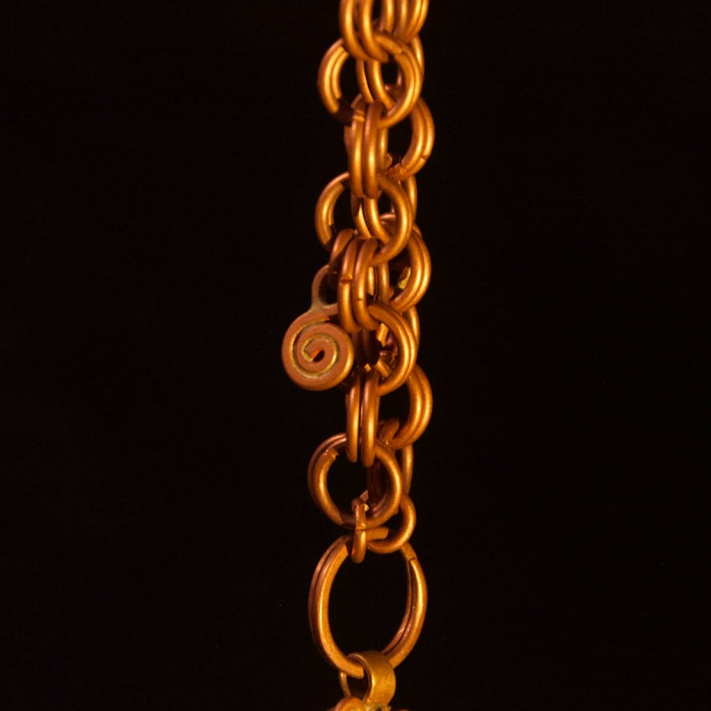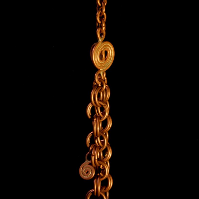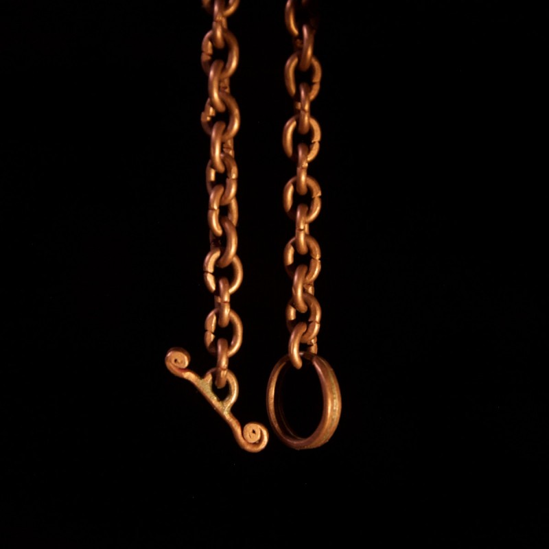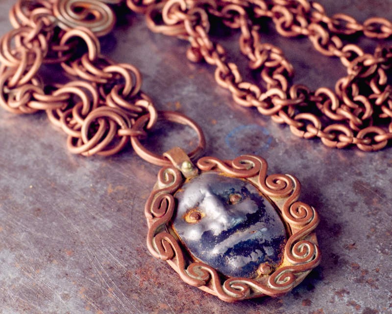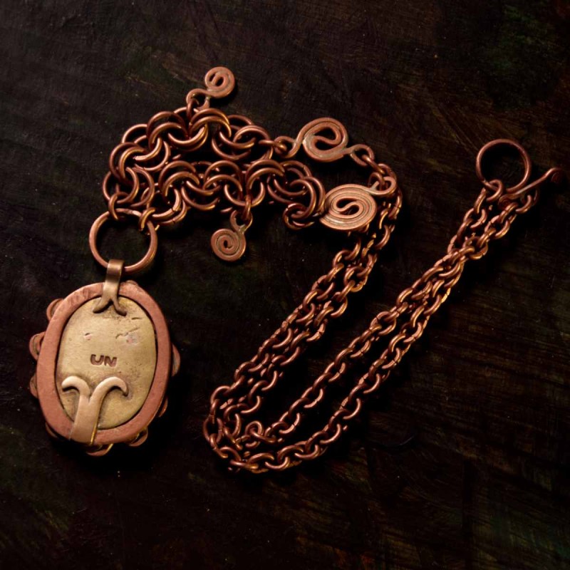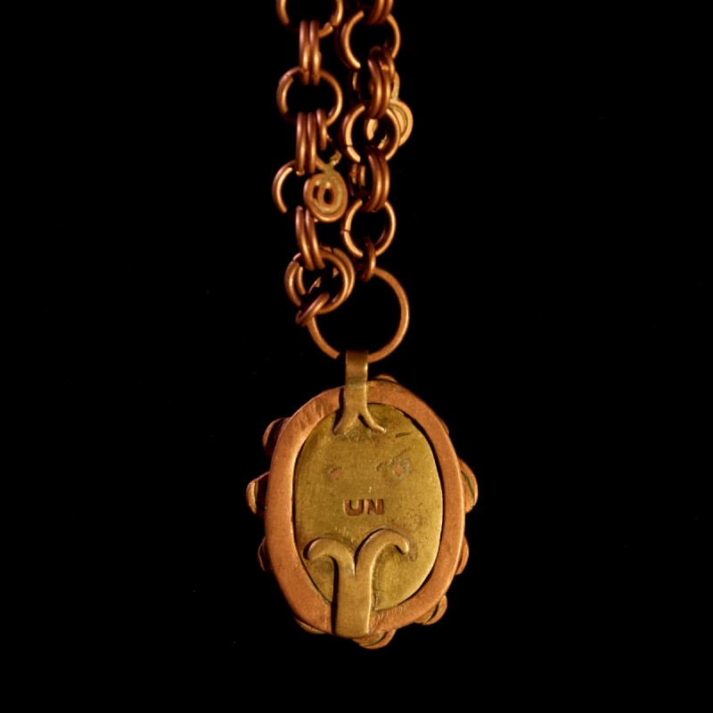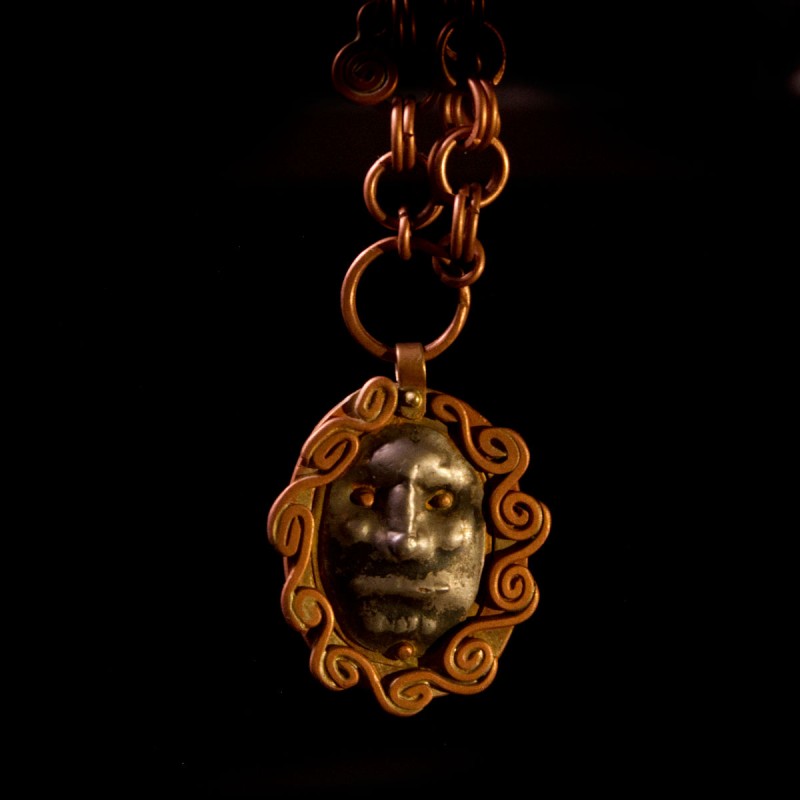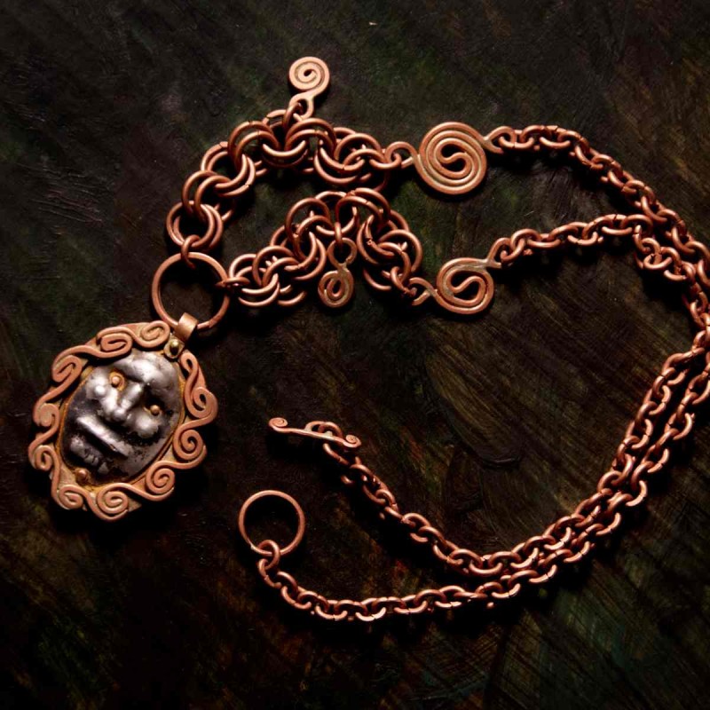 Materjal. Vasest, messingist ja rauast kaelakee. Nägu on kohrutatud raudplekist ja needitud messingist alusele. Keti pikkus 65cm. Vask detailidel on tuhm/matt töötlus.