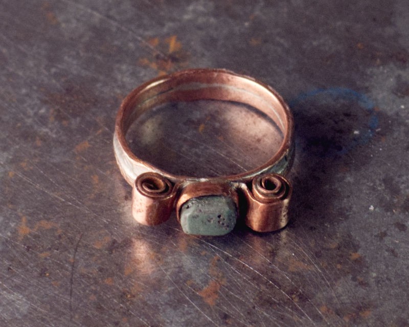 Lugu. Edevus tuleb kahest vaskspiraalist, mis kaunistavad Musta mere äärest leitud kivi. Käisime kunagi 80-ndatel Gagras, Musta mere ääres puhkamas ja ema korjas sealt palju kauneid kive. Lihtsalt mererannalt. Need on urbsed ja kergesti töödeldavad kivid. Sõrmuse võru on kaunistatud punsliga peale löödud mustriga.
