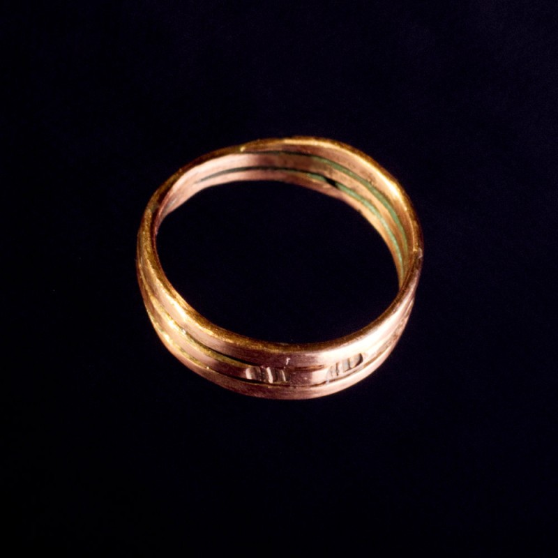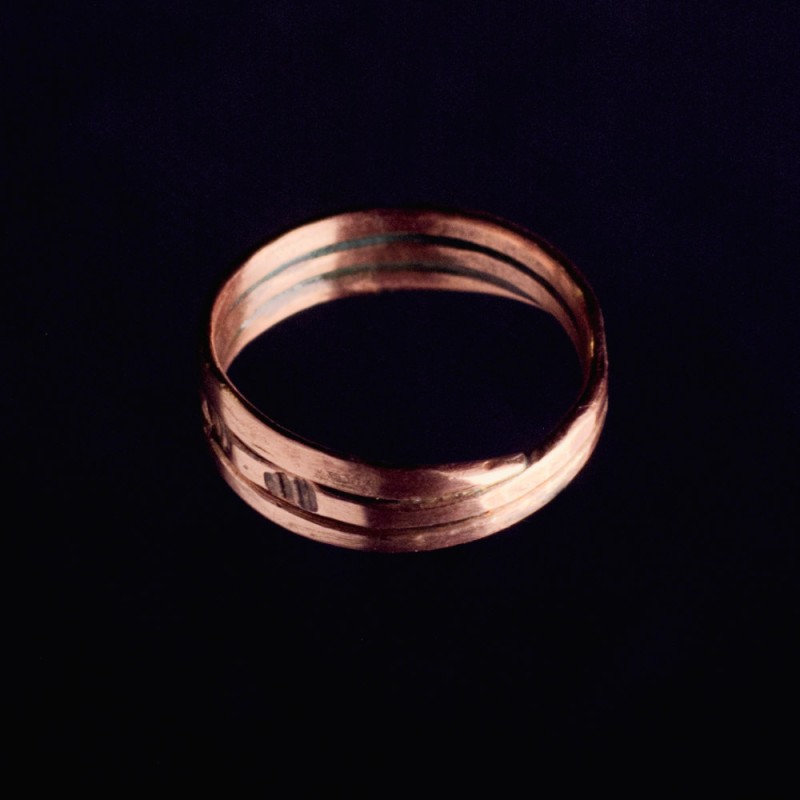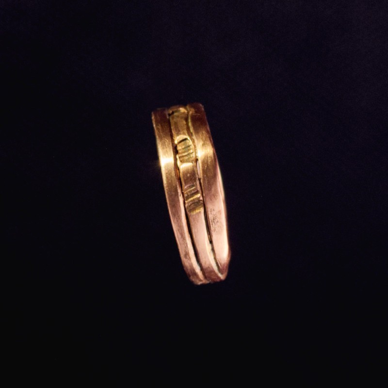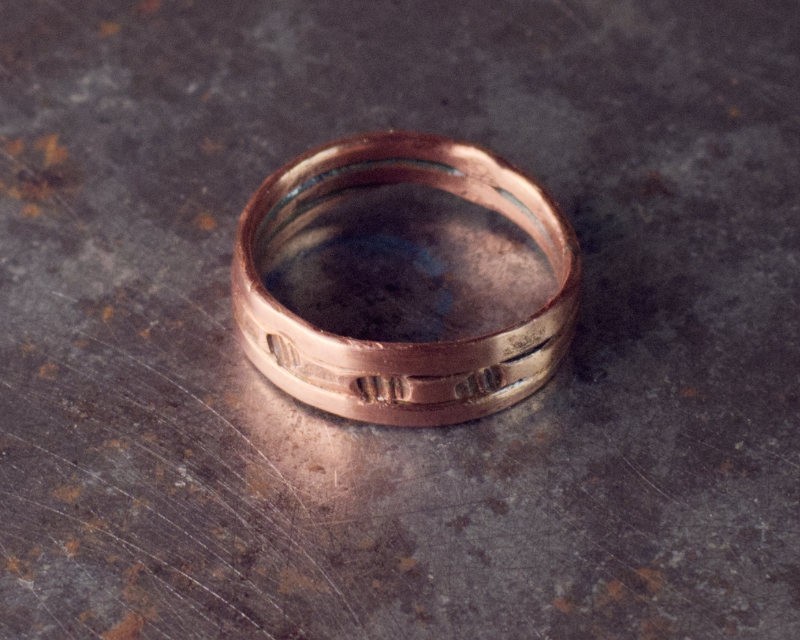 Materjal. Vasest sõrmus, punsliga löödud märkidega.